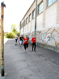 PAMOKA: Per kūno kultūros pamoką septintokės bėga aplink mokyklą duobėtu asfaltu.