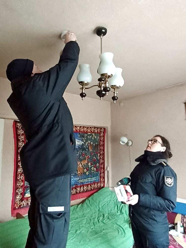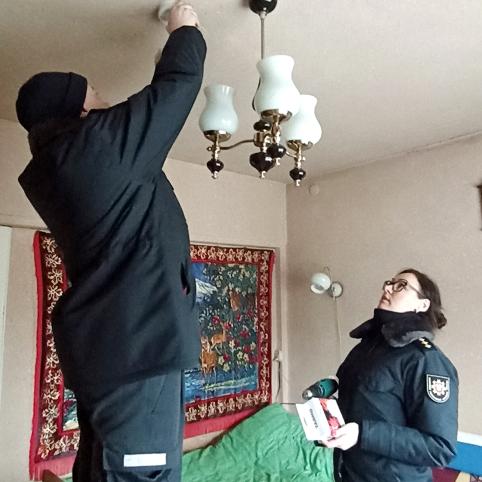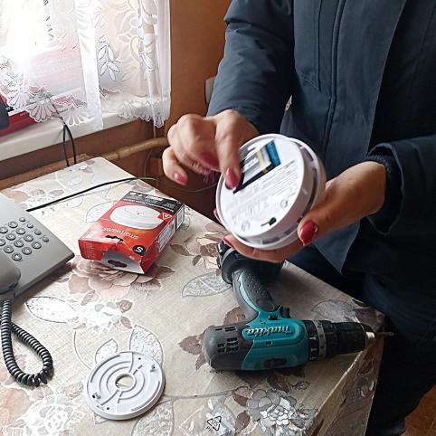 Atrodo, viskas iš pirmo žvilgsnio lyg ir gerai, tačiau specialistai senjorės namuose pasigedo dūmų detektoriaus. „Turiu dūmų detektorių, tik jis...kitam kambary, stalčiuje, nes nėra kaip prie lubų prisukti“,- aiškino E. Tatorienė. Pasirodo, nuo ilgo stovėjimo stalčiuje išsikrovusi dūmų detektoriaus baterija. Specialistai ją pakeitė nauja ir instruktavo: „Čia yra testavimo mygtukas ir reikia bent kartą per mėnesį jį paspausti, nes tik taip galima įsitikinti, ar prietaisas veikia. Jums pačiai gal ir bus sunku, bet jus lankanti darbuotoja už jus šį darbą atliks. Jei detektorius pradės po truputėlį pypsėti, neišsigąskite, reiškia, kad baterija jau į pabaigą. O jei dūmų detektorius ims skleisti šaižų, įkyrų pypsėjimą, žinokite, kad „pagavo“ dūmų ir jus įspėja apie galimą pavojų“. Paklausta, kokiu telefonu nelaimės atveju išsikviesti pagalbą, senjorė nesutriko: „Ogi 112“. Keletas minučių ir dūmų detektorius jau sėkmingai primontuotas prie gyventojos miegamojo lubų.