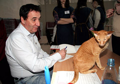 DRAUGIJA: Rytų veislės katiną atlaidžiai apžiūrinėjo norvegas teisėjas Henry Hornell.