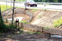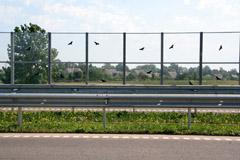 SIENA: Dalis akustinės sienos — iš permatomo plastiko, ant kurio pripiešta daug varnų. Gal tai apsauga tikroms varnoms? Kitos sienos dalys aklinos.