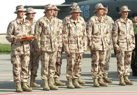 GRUPĖ: Vakar į misiją Afganistane išlydėti ketvirtosios Lietuvos vadovaujamos Oro pajėgų mokymo grupės kariai. Grupės vado kapitono Laimio Aleknavičiaus (kairėje) rankose – įteikta Lietuvos vėliava.