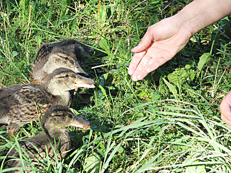 DRĄSA: Jaukūs ančiukai nebijo imti maisto iš rankų.