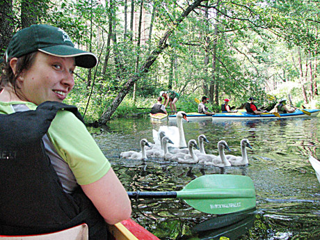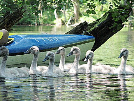 Upėje gulbinas įvaro baimės: plaukia drąsiai link baidarių. Įvertinęs, kad saugu, pasivadina ir visą šeimyną – gulbę su septyniais gulbiukais. Visi drąsiai suka prie baidarių: reikalauja maisto. Stabdo baidares tarsi vestuvininkų automobilius.