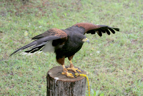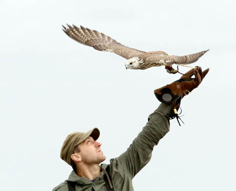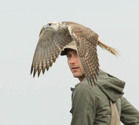 Sakalas Joerg įsitaiso ant Michal rankos, apmautos pirštine. Ant sakalo galvos užmaukšlinta mini kepuraitė. Ji trukdo matyti, tad paukštis ramiai ir kantriai tupi ant savininko rankų. Kai tik kepuraitė bus nuimta, sakalas akimirksniu šaus į orą sučiupti grobio.