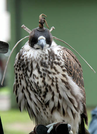 SAKALAS: Kepuraitė sakalui trukdo matyti, tad paukštis išlieka ramus.