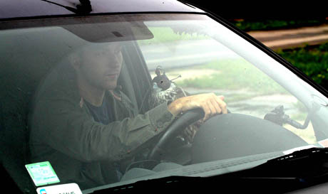 KELIONĖ: Michal Bien ir automobilyje nesiskyrė su sakalu.