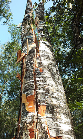 Kamiene nuo žemės iki žmogaus ūgio tęsėsi pailga drevė. Būtent per jos vidurį ir skilo beržas, o viršutinė dalis nulūžo maždaug trijų metrų aukštyje.