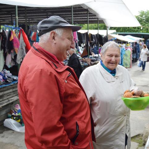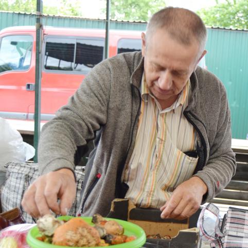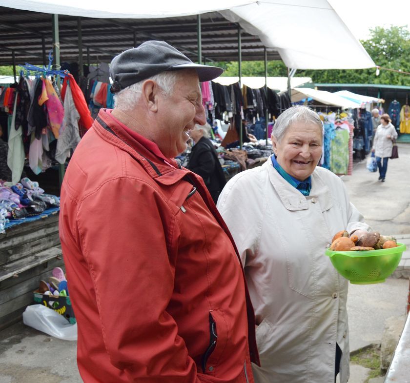 Šeštadienį pirkėjus Vytauto raudonviršiai, voveraitės viliojo. Kilogramas raudonviršių – 5 eurai, o litras voveraičių – 3 eurai. Pirmieji pirkėjai – iš Kilučių, Danutė Didžionienė ir jos sūnus Edmundas… Jie iškart apsisprendė: virs grybų sriubą.