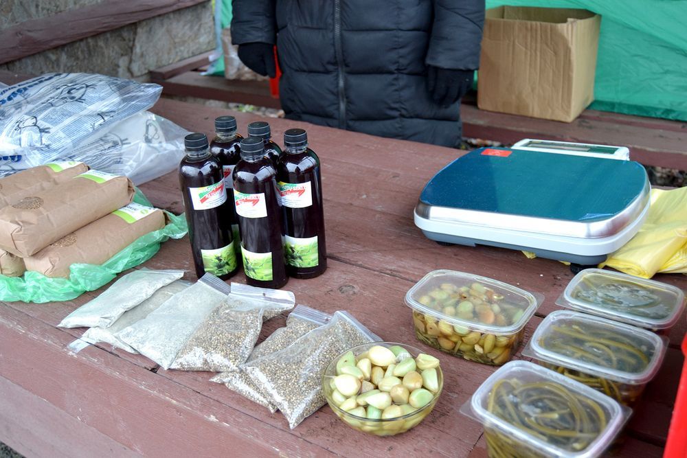Biržų turguje įvairėja vietos ūkininkų raugintų daržovių pasiūla. Pirkėjai graibsto raugintus raudonuosius burokėlius, todėl ne visuomet jų rasi. Nuo prekystalių tirpsta ir rauginti agurkai, rauginti kopūstai. Naujiena – rauginti česnakai bei rauginti česnakų žiedkočiai. Kilogramas raugintų česnakų skiltelių po 10 eurų, o 400 gramų česnakų žiedkočių – 2 eurai. Raugintų česnakų nebūtina pirkti visą kilogramą, pardavinėjama ir mažesniais indeliais. Šeštadienį pirkėjai džiaugėsi ir pigiais žieminiais česnakais. Už jų kilogramą pardavėja prašė dviejų eurų. Česnakų įvairovė iš Biržų krašto ūkininkų Misevičių ūkio. Ant turgaus prekystalio taip pat pirkėjų dėmesį atkreipė ir šio ūkio kanapių produktai: tamsiuose buteliuose supilstytas kanapių aliejus (0, 5 litrų) po 8 eurus, kanapių sėklos (100 gramų po 2 eurus), kanapių druska (100 gramų po 1,50 eurų). Turgaus lankytojai, kurie jau išbandė kanapių sėklas ir kanapių druską gyrė, kad tai puikus prieskonis. Turgaus lankytojų dėmesys krypo į ekologiškus grikius. Už 800 gramų grikių maišelį pardavėja prašė 2 eurų. Grikių lukštų pagalvės kainavo nuo 8 iki 20 eurų.