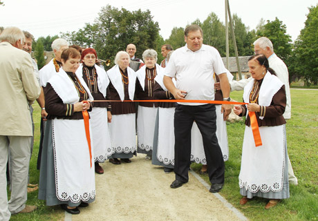 ŠVENTĖ: Algirdas Milašauskas, Bubių bendruomenės pirmininkas, ruošiasi perkirpti simbolinę aikštės atidarymo juostą.