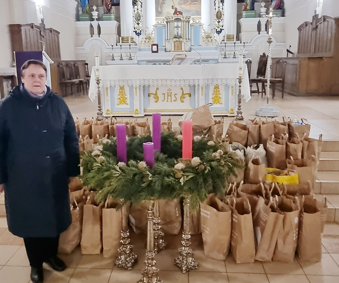 Biržiečių paaukoti maisto produktai sekmadienį buvo palaiminti Šv. Jono Krikštytojo bažnyčioje per šv. Mišias, o vėliau išdalinti skurstantiesiems.