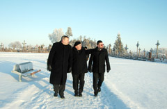 POŽIŪRIAI: Ir žingsniuodami iš Kryžių kalno dar tariasi (iš kairės) Šiaulių rajono meras Algimantas Gaubas ir Jono Pauliaus II piligrimų kelio kūrimo priežiūros komisijos pirmininkai, Kauno arkivyskupas Sigitas Tamkevičius ir Ūkio ministerijos kancleris Gediminas Miškinis.