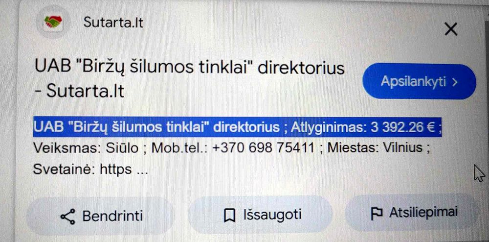 Internete neseniai mirgėjo skelbimas, kad ieškomas „Biržų šilumos tinklų“ direktorius. Už šias pareigas siūloma 3392 eurų mėnesinė alga (neatskaičius mokesčių) arba beveik 2 tūkst. eurų „į rankas“. Kaip vienas iš pagrindinių reikalavimų įvardijamas išsilavinimas, priklausantis inžinerijos mokslų studijų krypčiai ir ne mažesnė nei vienerių metų vadovaujamo darbo patirtis.