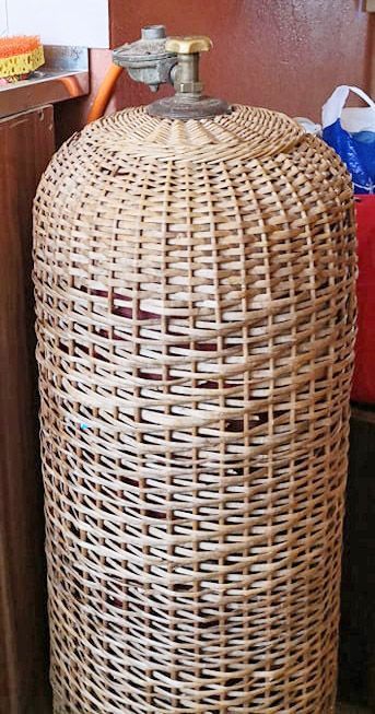 Dujų balionas kaip interjero detalė. Vienos šeimininkės dujų balionams siuva sukneles, kitos pina karklo vytelių lopšelius.