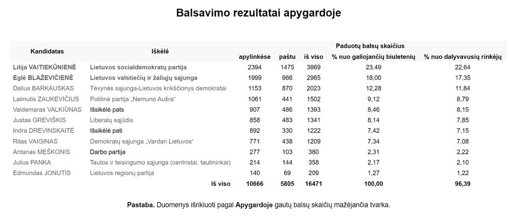 Kiek daugiau nei penktadalį, tai yra 22,64 proc. Sėlos vakarinės apygardos rinkėjų balsų surinkusi L. Vaitiekūnienė sakė: „Truputį netikėta, kad surinkau tiek daug balsų. Tikrai nesitikėjau tokio žmonių palaikymo. Labai dėkoju visiems, kurie atėjo į rinkimus ir palaikė mane. Sakyčiau, gan normalus buvo aktyvumas. Jei atvirai, esu dar šiek tiek pasimetusi ir visos mintys sudėtingai dėliojasi“.