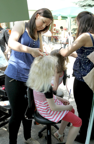 KŪRYBA: Profesinio rengimo centro kirpėjų specialybės studentės norintiesiems darė šukuosenas.