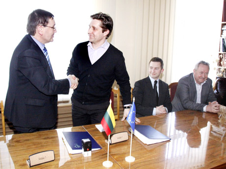 SUTARTIS: Sutartį dėl 20 milijonų litų investicijų į Šiaulių pramoninį parką pasirašė (iš kairės) Šiaulių meras Justinas Sartauskas, „ROL/Statga“ direktorius Rytis Dijokas stebint ROL grupės generaliniam direktoriui Niklas Sahlqvist bei kitiems kompanijos atstovams.
