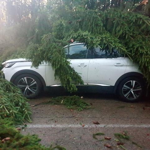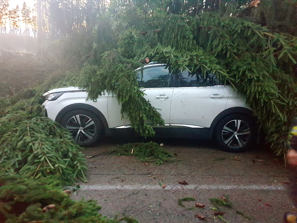 Automobilį prispaudė didžiulė eglė