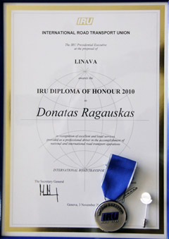 APDOVANOJIMAS: Tarptautinės vežėjų sąjungos (IRU) apdovanojimai — diplomai ir medaliai įteikti 22 Lietuvos sunkvežimių ir autobusų vairuotojams, praėjusiais metais pripažintiems geriausiais Europoje.