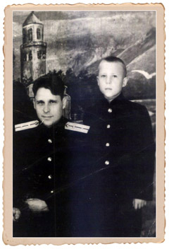 UNIFORMA: Eduardas (dešinėje) vienintelis mokykloje vilkėjo uniformą, kuri buvo pasiūta pagal geležinkelininko uniformos modelį. Šalia — jo tėtis Viktoras.