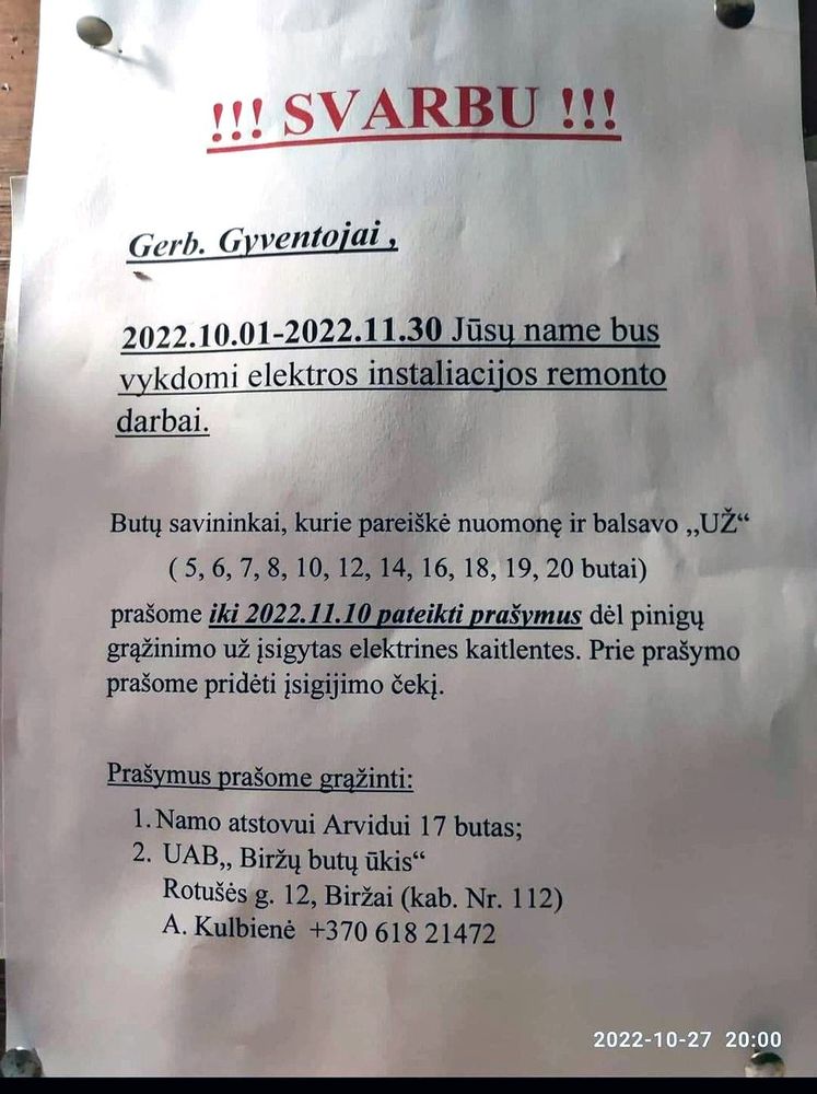 „Elektrinės viryklės nupirktos, stovi neišpakuotos ir tik vietą butuose užima, negalime jomis naudotis, nes name vis dar nepakeista (kaip buvo žadėta) elektros instaliacija. Namo administratorius nieko neinformuoja, nieko nežino. Po ilgų ieškojimų mus pasiekė informacija, kad rangovas šiemet jau nebespės atlikti darbų. Kas? Kodėl? Kaip? Niekas nedetalizuota. Įdomu, kiek dar reikės laikyti nupirktą viryklę nenaudojamą ir kas už tai yra atsakingas. Kodėl nėra jokios priežiūros vykdomiems projektams“,- prašė išsiaiškinti Vabalninko Pergalės gatvės 8 A namo gyventoja.