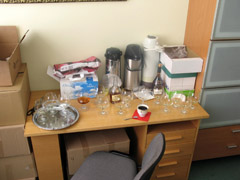 Cerberio pareigas ėjusi viešųjų ryšių specialitė nebedraudžia užeiti į vidų. Ant posėdžio stalo – tuščios ir nebaigtos gerti taurės, vaišių likučiai. Tokios pat atsargos ir šalia salės esančiame kambarėlyje.