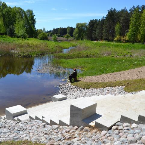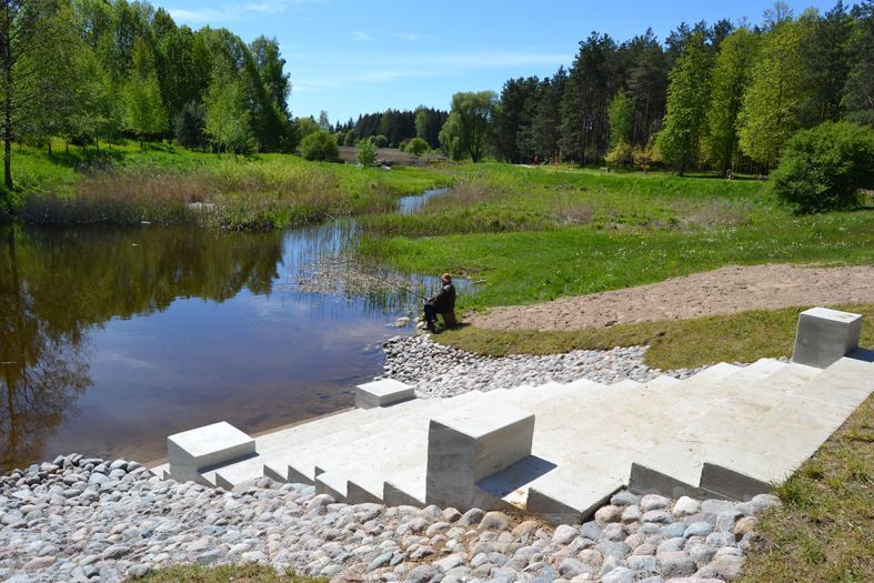 Pats vidurdienis. Parke žmonių nedaug. Pakrantės naujiena – laiptai į upę. Kai kas juos kritikuoja. Per daug masyvūs tokiai pakrantei. Be to pavojingi. Bus traumų. Pasigendama turėklų... Vyriškis netoliese iš upės traukia žuvį.