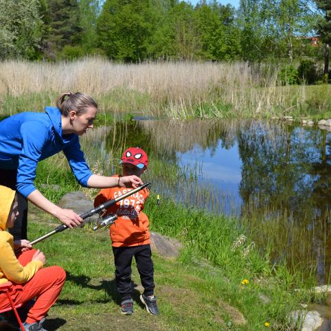 Simpatiška mamytė Samanta vyresnėlį Tomą prie Apaščios upės moko žvejoti. Pamokėles stebi mažasis broliukas Adamas.