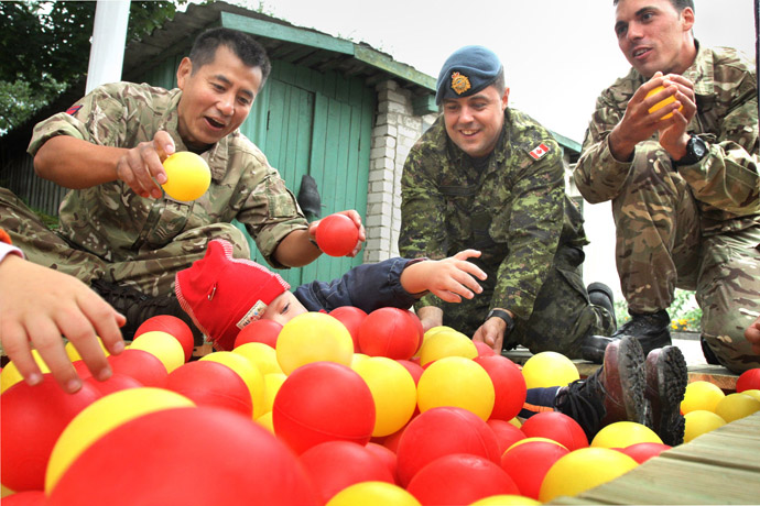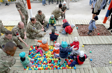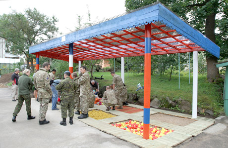 Šiaulių miesto savivaldybės Sutrikusio vystymosi kūdikių namuose mažyliai ir NATO oro policijos misiją baigiantys britų kariai išbandė naują pavėsinę. Ją po darbo už savo lėšas sumeistravo patys kariai.