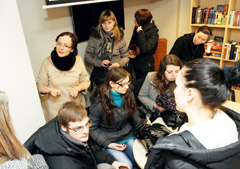 KURSAI: Į pirmąjį dalykinės rusų kalbos pažengusiesiems kursų susitikimą Rusų kalbos ir kultūros centre iš 50 lauktų atėjo tik 15 norinčiųjų juos lankyti. Centro vadovė Svetlana Karavajeva (viršuje kairėje) nesistebi: „Dalis, manau, natūraliai nubyrės: kažkas atėjo pragmatiškai vien todėl, kad kursai nemokami, kiti prasidėjus pavasariui nebenorės jų lankyti, treti galbūt dar neįvertino savo galimybių“.