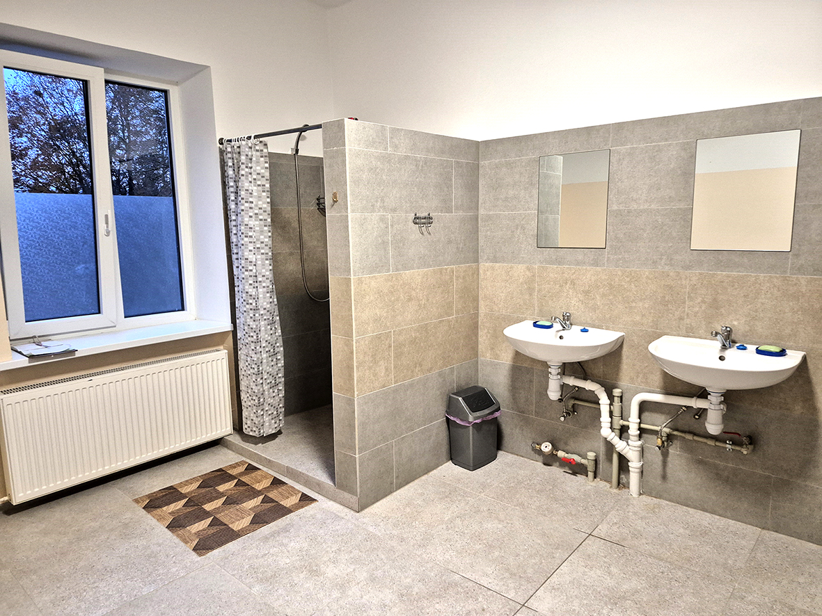 Šiuolaikiškai suremontuota Vabalninko socialinio bendrabučio prausykla, tualetai.