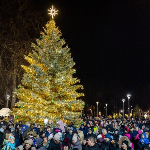 Šių metų žaliaskarė, kaip teigiama, atvežta iš Meilūnų kaimo – ją dovanojo Linas ir Regina Januškevičiai. 10 metrų aukščio eglės amžius – apie 30 metų. Dailiai nuaugusi miesto puošmena džiugins akį iki Trijų Karalių.