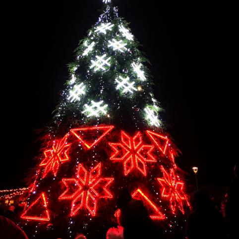 2018 metais miesto eglę puošė UAB „Lumidėja“, puošyba savivaldybei kainavo brangiau negu paskutinius dvejus metus – netoli 16 tūkst. eurų. Eglutė tviskėjo sidabriniais ir auksiniais paukščiais ir žvaigždėmis. Eglutės įžiebimo vakarą susirinkusieji stebėjo pasirodymą „Snieguolė ir septyni nykštukai“, važinėjosi šventiniu autobusiuku, Kalėdiniuose namukuose buvo prekiaujama skanėstais.