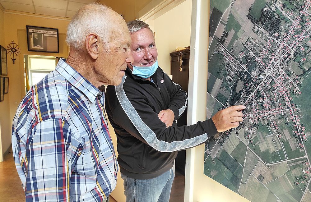 Muziejininkas Evaldas Levanas rodo Garbės piliečio vardą pelniusiam Vabalninko krašto šviesuoliui Algirdui Garbauskui sodybas, kurios dar išlukusios, o kuriose jau niekas negyvena.