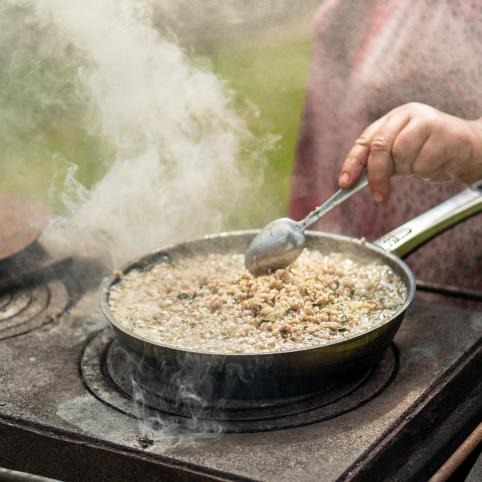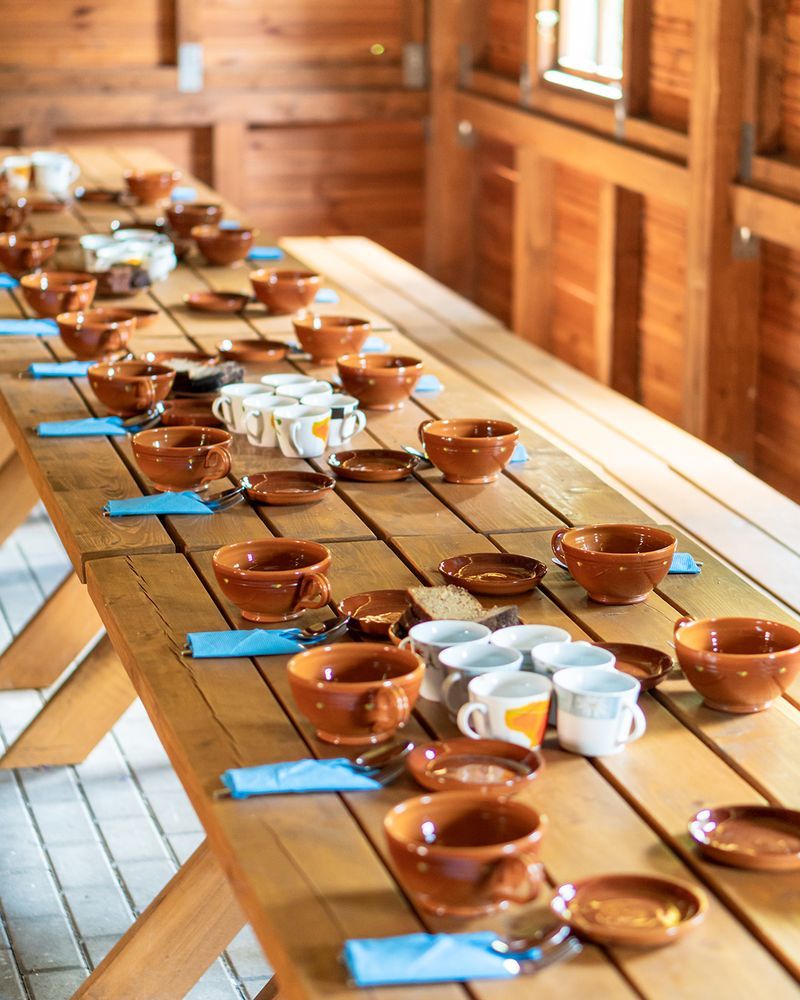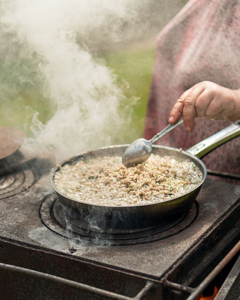 Kol kas Kirkilų amatų centras – po raktu. O bendruomenės namų kiemelis – dūmuose. Ant laužo didžiuliame 2,5 kibiro katile burbuliuoja žuvienė. Kiek tolėliau keptuvėje plepa perlinių kuopų košė. Kvepia kepami rupiai maltų kviečių blynai. Su spirgučiais, su obuoliene... Atgaivai – čiobrelių, metų arbata. Bendruomenės šeimininkių tautinio paveldo patiekalų valgiaraštį paįvairino rabarbarai. Rabarbarų uogienė, rabarbarų gira...