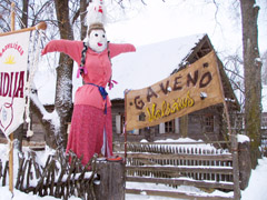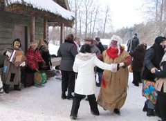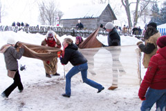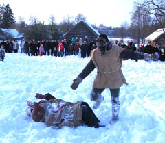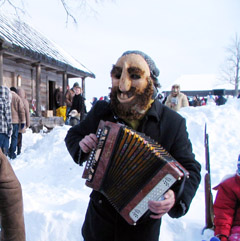 Buities muziejaus gatvelėje — maišalynė: vienas už kitą įspūdingesnėmis kaukėmis pasipuošę šventės dalyviai tai armoniką tampo, tai šoka, tai taikosi kaimyną į pusnį įversti, kitaip pokštauja.