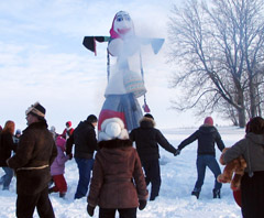 Labiau vyriškas žaidimas — futbolas ant sniego. Žaidėjai iš vilnos suveltą kamuolį į vartus turi pataikyti ne spirdami kojomis, o varydamiesi šluotomis.