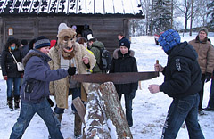 RUNGTIS: Viena iš šventės rungčių — traukiamu pjūklu nupjauti kuo plonesnę ir dailesnę rąsto dalį.
