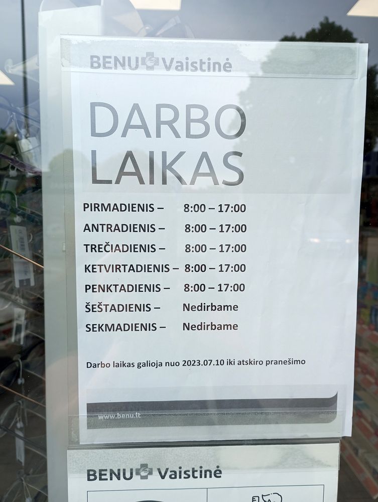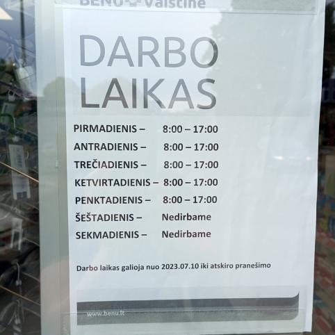 Nuvykę į vietą randame prie durų darbo grafiką, kuriame yra pataisymų – sekmadieniais nedirba. Beje, ne tik Biržuose, bet ir Pasvalyje sekmadieniais dirbančių vaistinių nėra.