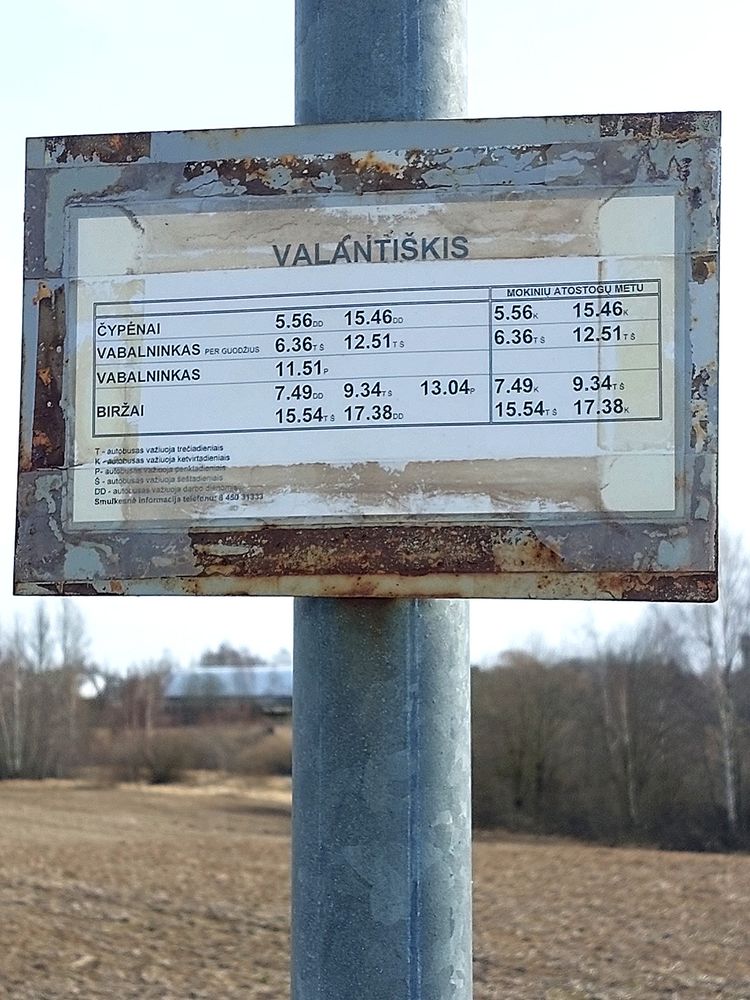 “Aš dažnai autobusu važiuoju į kaimą, o paskui atgal į Biržus, o stotelėje pakabintoje lentelėje nurodytas laikas neatitinka tikrovės – tokiomis valandomis autobusai nevažiuoja. Kaip žmonėms žinoti tikslų laiką?“- apie Valantiškio autobusų stotelę, esančią kelyje į Klausučius, kalbėjo biržietė. Ji pastebėjo, kad stotelėje, esančioje kitoje gatvės pusėje lentelės išvis nėra.