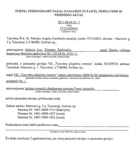 DOKUMENTAS: Sutartyje parašyta, kad bažnyčia ir tvoros atiduodamos viešajai įstaigai Tytuvėnų piligrimų centrui.