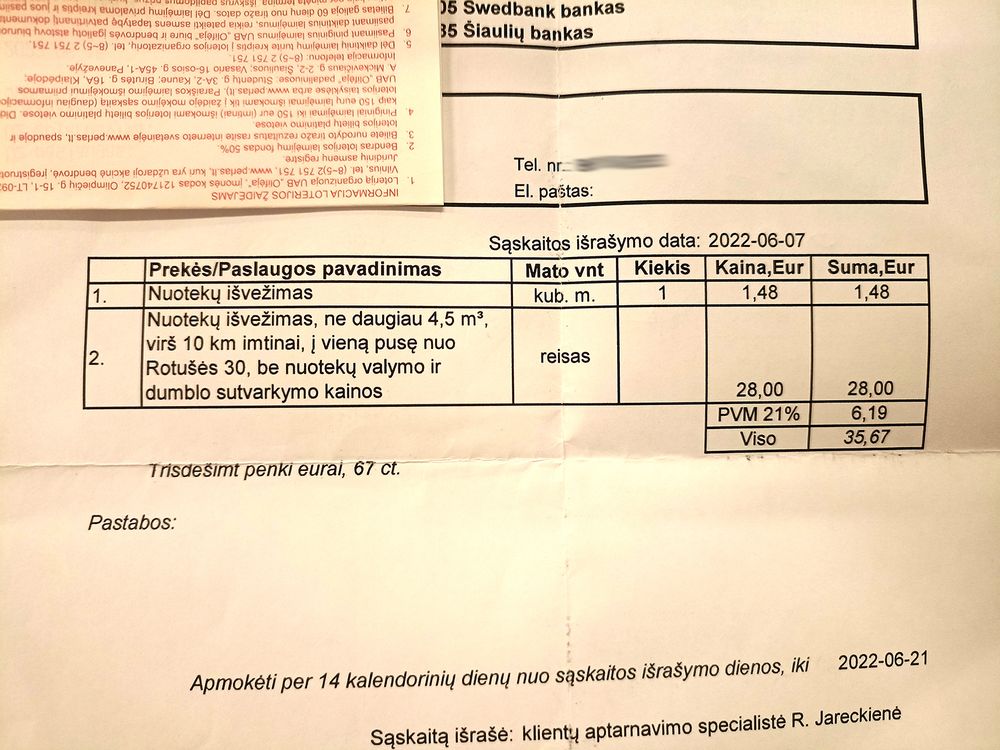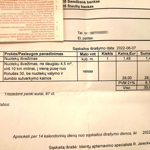 „Sąskaitoje atsirado papildoma skiltis „reisas“, o joje – fiksuota suma už nuotekų išvežimą net 28 eurai (be PVM). Anksčiau jos nebuvo. Susimokėdavau maždaug šešis eurus už ištrauktą vieną kubinį metrą nuotekų ir tiek. Dabar sąskaitoje matyti, kad vieno kubo nuotekų kaina sumažėjo, tačiau atsirado mokestis už išvežimą. Tokia pat sąskaita atėjo ir mano mamai – ji irgi buvo šokiruota. Kadangi abi gyvename tame pačiame kaime, tai liepos mėnesį bandėme ieškoti kompromiso – prašėme nuotekų išvežėjų, kad į sąskaitą rašytų du kubinius metrus nuotekų (mano ir mamos), kad abi už išvežimą po keliolika eurų „susimestume“. Jie nesutiko ir mums išrašė atskiras sąskaitas, todėl abiems su mama teko mokėti visą kainą. Naujas nuotekų išvežimo mokestis, mano manymu, visiškai neadekvatus. Suprastume, kad jie ištraukia vieną kubinį metrą nuotekų ir važiuoja į Biržus, tačiau kai tuo pačiu reisu sustoja ir nuotekas traukia iš kelių kiemų, mokestį ima atskirą, lyg iš Biržų specialiai važiuotų, tai jau apiplėšimas vidury baltos dienos. Jie tikrai tiek kuro neišnaudoja, kiek iš žmonių lėšų susirenka“,- piktinosi papilietė.