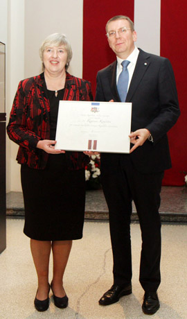 ĮVERTINIMAS: Latvijos užsienio reikalų ministras Edgars Rinkevičs įteikė ministerijos padėką Šiaulių universiteto docentei, Baltų centro vadovei Reginai Kvašytei „Už reikšmingą indėlį į Latvijos Respublikos stiprinimą“.