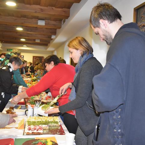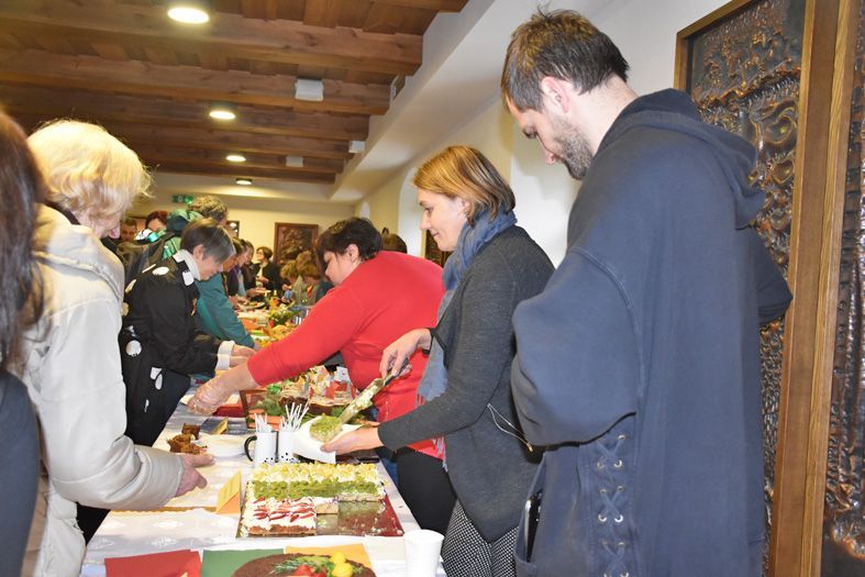 Nu­si­fo­tog­ra­fa­vę Pi­lies fo­ne, prie plaz­dan­čios Tris­pal­vės, iš­kil­mių da­ly­viai pa­trau­kė į ar­se­na­lo sa­lę, kur lau­kė il­giau­sias sta­las, nu­krau­tas tor­tais ir py­ra­gais.