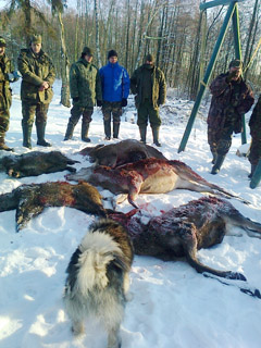 Medžiotojai laimikį – tris elnius ir du šernus – atvežė į gyvūnų išdorojimo vietą. Žvėrims nudirtas kailis, mėsa išdorota ir padalyta visiems norintiems.