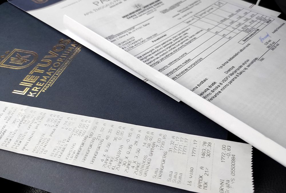 Moteris skaičiuoja, kad laidotuvėms iš viso išleido didesnę nei pustrečio tūkstančio eurų sumą. Dar ir dabar turi visus čekius pasilikusi. Sako, gerai, kad jų neišmetė – dabar galinti ramiai paskaičiuoti. „Pirkome karstą vieną iš pigesnių, tai sumokėjome 390 eurų. Kremavimas kainavo beveik keturis šimtus, arti dviejų šimtų eurų – urna, dar nepigios gėlės, beveik 230 eurų kainavo laikymo šaldytuve, aprengimo, įnešimo į salę, dokumentų sutvarkymo ir kitos paslaugos, neskaičiuojant šarvojimo salės nuomos. 120 eurų kainavo duobės urnai iškasimas, 100 eurų davėm kunigui, dar tiek pat giedoriams, o kur dar transportas, gedulingi pietūs trisdešimčiai žmonių...“,- vardijo Lina, pridurdama, kad paminklo kaina čia neįskaičiuota. Artimojo netekusi moteris gavo ir vienkartinę išmoką – 368 eurus. „Galima sakyti, kad šios sumos neužteko net karstui“,- atsiduso ji.
