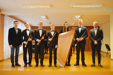 DALYVIAI: Alvaidas Bernotas (kairėje) su mokiniais respublikiniame Povilo Samuičio liaudies pučiamųjų instrumentų ansamblių festivalyje.