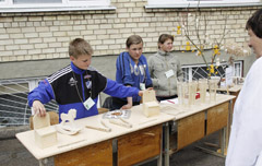 MUGĖ: Ant Joniškio jaunimo ir suaugusiųjų mokyklos stalo — gaminiai iš medžio.
