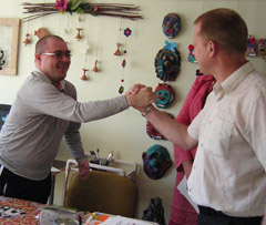 PASISVEIKINIMAS: Dienos užimtumo centro lankytojas Artūras (kairėje) efektingai pasisveikina su mokyklos direktoriumi Tomu Armonavičiumi.