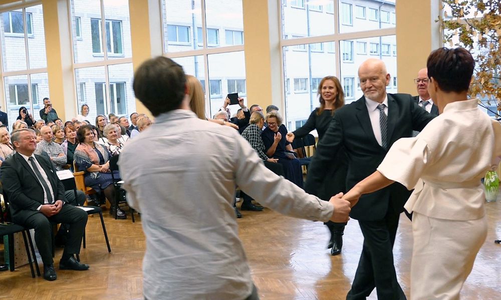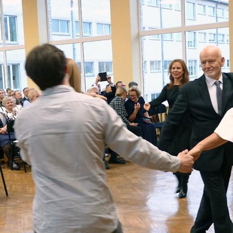 Simboliška akimirka, sugraudinusi žiūrovus – pakviesta bendru šokiu prisiminti BTVMC ir Vabalninko žemės ūkio mokyklos jungtuves. Šokio centre – buvęs mokyklos direktorius Petras Narkevičius.